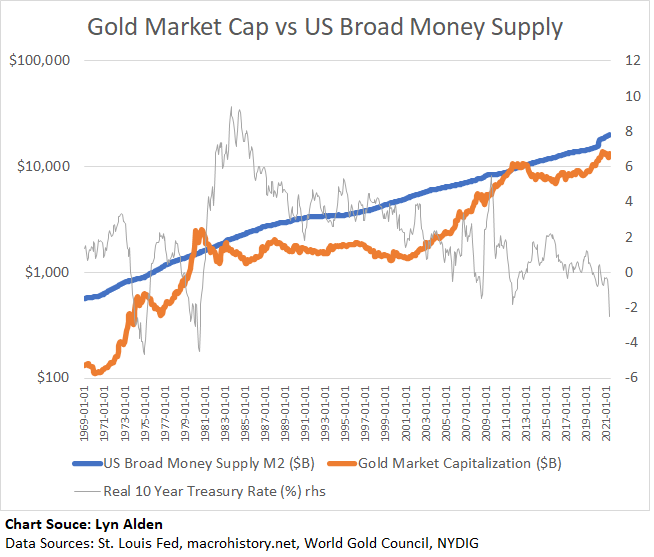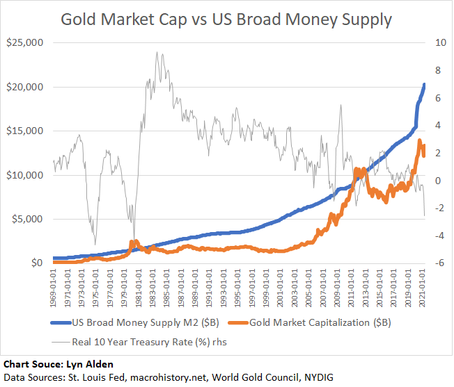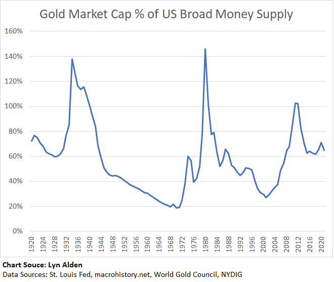 Here’s an annual chart, with over a century of data, that shows the estimated global gold market capitalization compared to the US broad money supply: