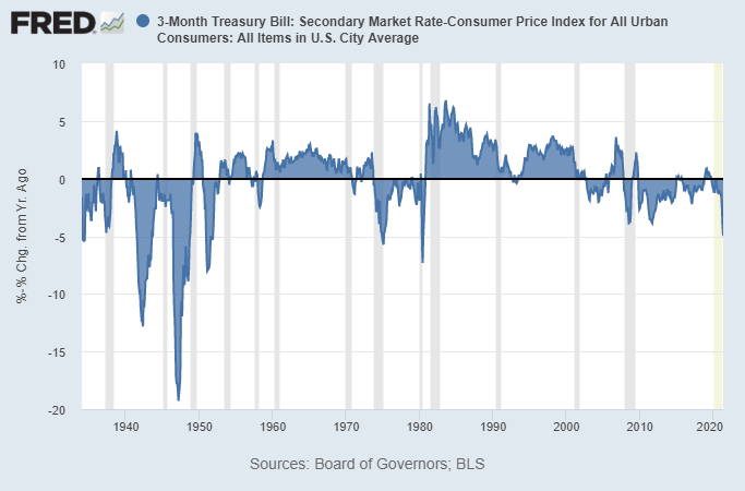 The only way to counteract that is to hold cash with a bank to earn interest, and thus involve a counterparty. In particularly inflationary decades, the interest often isn’t enough to keep up with inflation. This chart shows T-bill interest rates minus the official CPI inflation rate since the 1930s; whenever it’s below zero it means T-bills (and by extension bank cash accounts that generally have similar rates) aren’t keeping up with inflation even when earning a yield.