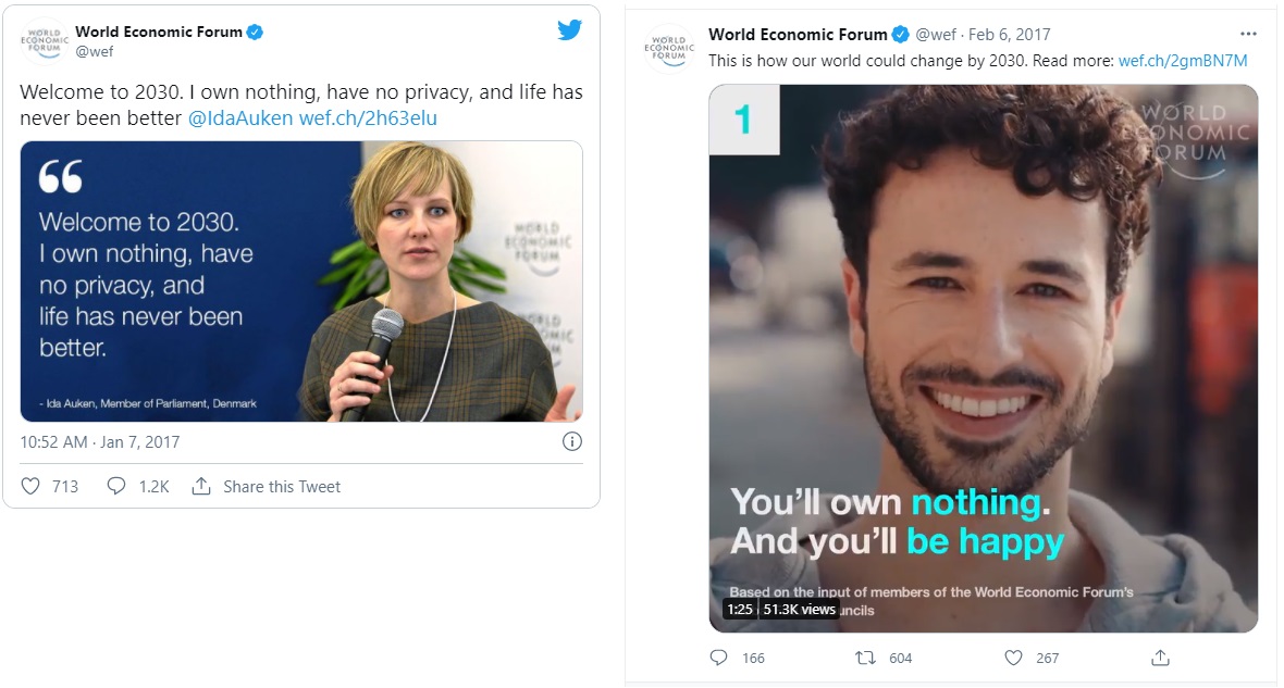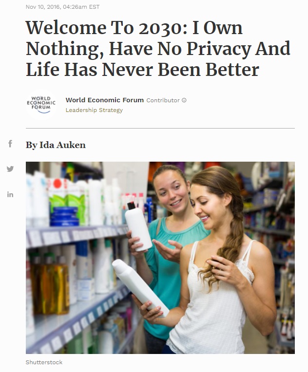 Back in 2016, the World Economic Forum had a blog article called, “Welcome to 2030: I Own Nothing, Have No Privacy, and Life has Never Been Better,” by Danish politician Ida Auken. The World Economic Forum followed this up with a 2017 social media campaign that included themes from that article.