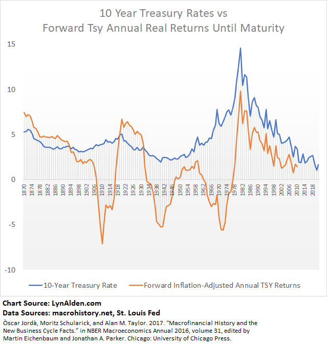 And for longer-term savings instruments, here is a chart of the inflation-adjusted forward annualized rate of return of buying 10-year Treasury notes that year and holding them to maturity. You can see the three decades where bondholders got massacred, because the underlying dollars were devalued. During those times, anyone who bought Treasuries and held to maturity received annualized real returns of as low as -4% or -5% during the full duration of the note.