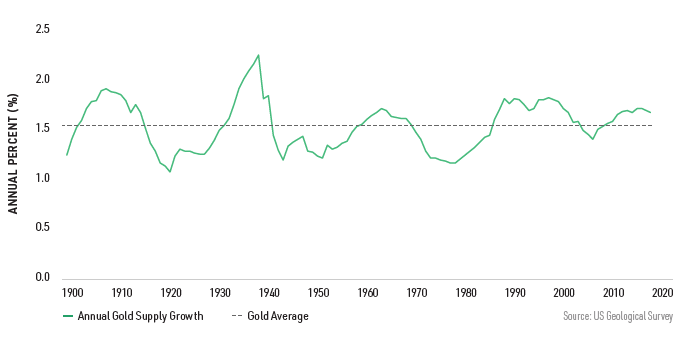 It’s hard to find big and accessible earth deposits of it, and it requires processing many tons of rock to get a tiny amount of gold, so only about 1.5%-2.0% gold is dug up each year as a percentage of the current amount that is estimated to exist above-ground. Gold has a 1.5%-2.0% average annual monetary inflation rate, in other words. This has historically been about the same rate as world population growth, so the amount of gold per capita has been pretty consistent over time.