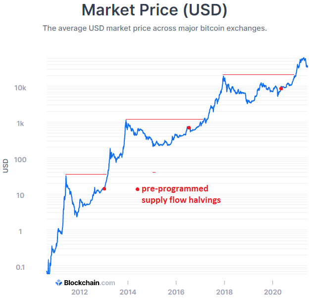 So far, bitcoin’s biggest correlation is with its own supply cycle. Every four years, the number of new coins generated by the algorithm every 10 minutes gets cut in half, and there tends to be a “post-halving” bull run. Here’s the bitcoin price in log form, with halving points annotated: