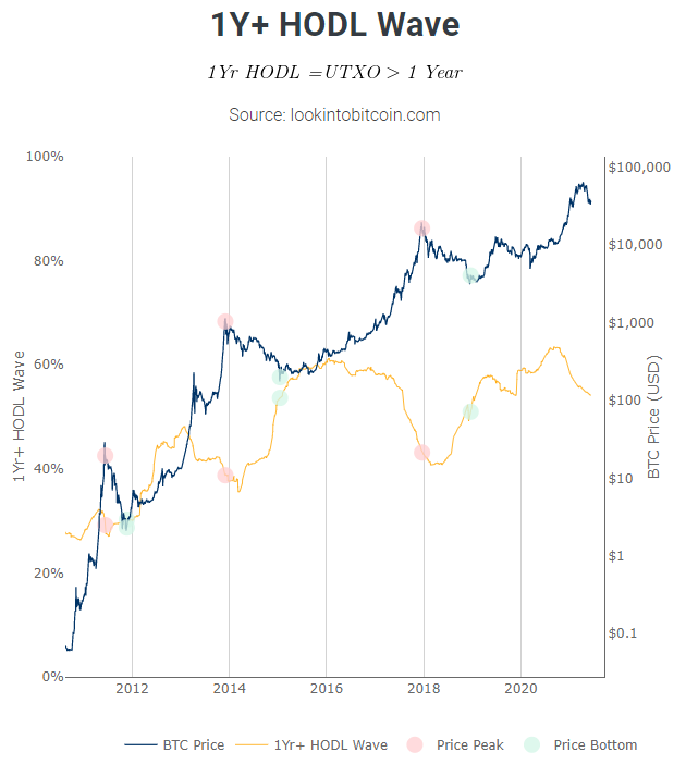 If we look at on-chain data, the percentage of bitcoin held by long-term holders tends to decrease during bull markets and increase during bear markets, as the protocol goes through these big distribution cycles: